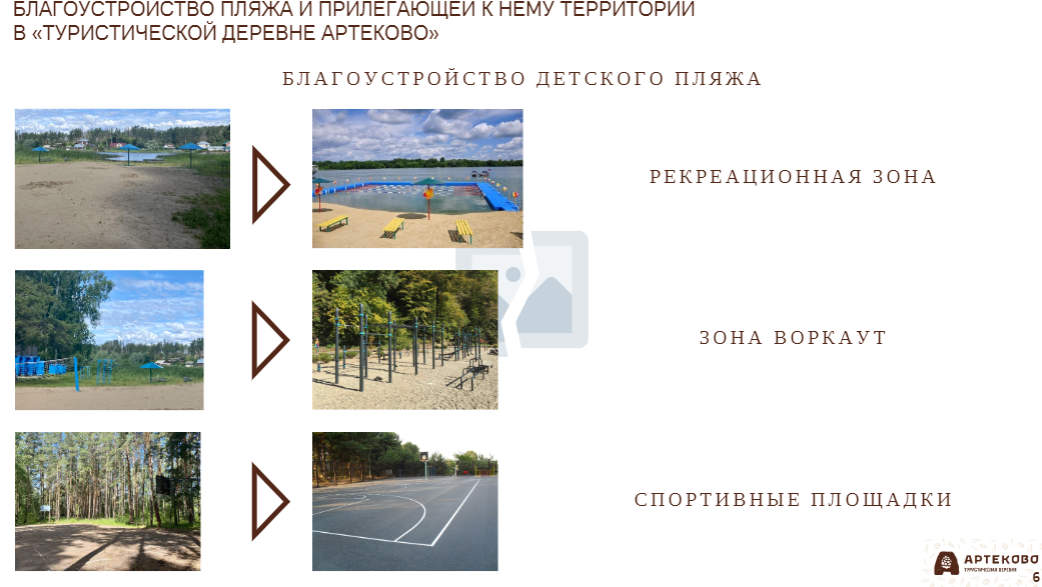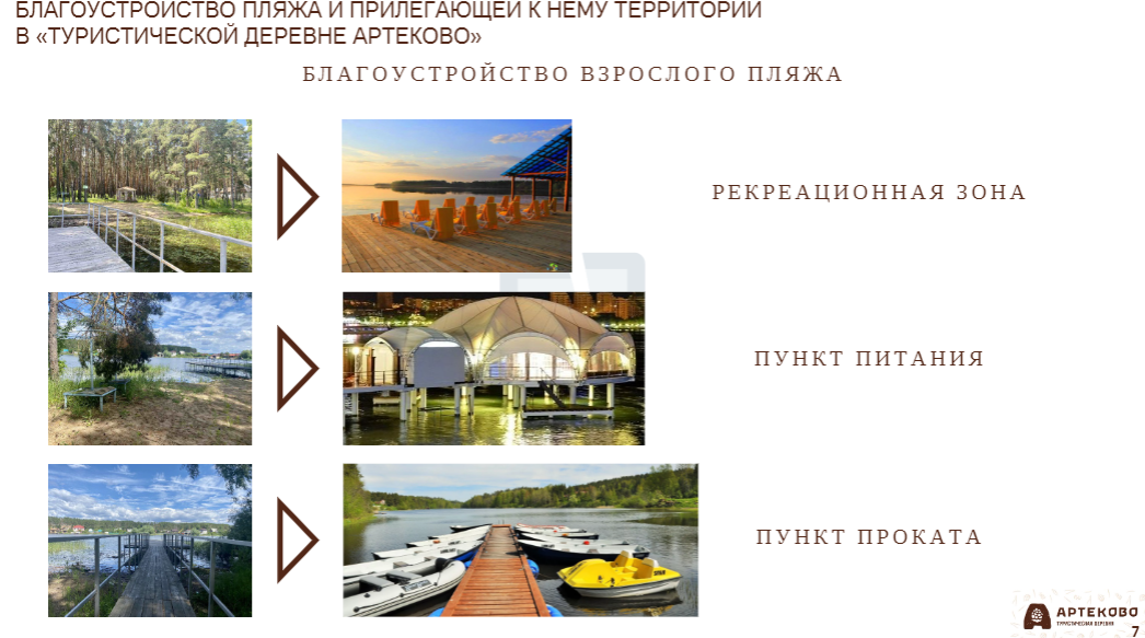Директор туристической базы Евгения Кадебина рассказала, что проект рассчитан на семейный отдых с детьми. Здесь будет парковка, места для питания, а для безопасности людей организуют охрану. Курить и распивать алкоголь запретят. Также в перечень услуг «Арте-пляжа» включат организацию детских праздников. В проект было вложено 1,9 млн федеральных и около миллиона — собственных средств инвестора.