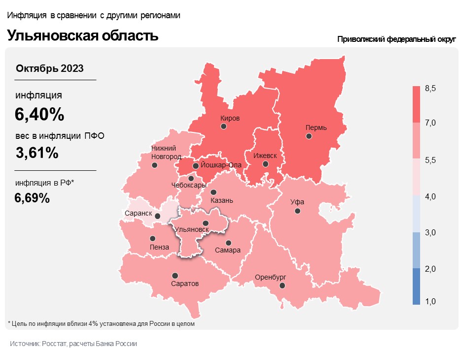 Банк России опубликовал информационно-аналитический комментарий об инфляции в Ульяновской области в октябре 2023 года. В этом месяце она ускорилась до 6,40% после 6,29% в сентябре.