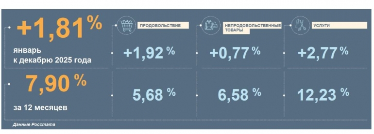 Заметнее всего в январе выросла стоимость услуг. Продукты питания тоже подорожали, при этом годовой прирост цен на них сложился ниже, чем на непродовольственные товары и услуги. Меньше всего в январе подорожали непродовольственные товары.