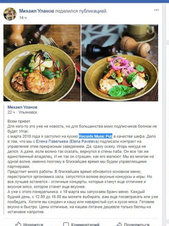 - С марта 2018 года заступил на кухню Records Music Pub в качестве шефа. Мы с Еленой Павельевой подписали контракт на управление этим прекрасным заведением. Да, сразу скажу, Игорь никуда не делся. Он даже, если можно так сказать, вернулся в стены паба. Он все так же единственный владелец. И не так он страшен, как его малюют. Мы во многом на одной волне, именно поэтому в ближайшее время будем управляющими партнерами, - пишет Михаил.