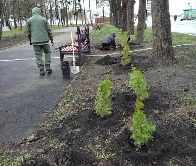 Сегодня, 22 апреля, специалисты работают в Николаевском сквере, расположенном между эспланадой и Краеведческим музеем. Здесь высажены 18 туй и четыре ивы.