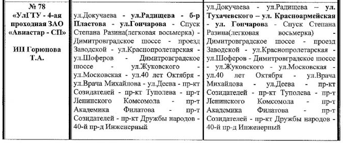 № 78 «УлГТУ – 4-ая проходная ЗАО «Авиастар – СП» (ул. Докучаева – ул. Радищева – ул. Тухачевского – ул. Красноармейская – ул. Гончарова – Спуск Степана Разина (легковая восьмерка)