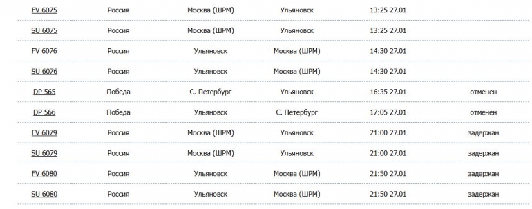 На данный момент, согласно онлайн-табло аэропорта в Баратаевке, задержаны вечерние авиарейсы авиакомпании «Россия»: из Москвы в Ульяновск и обратно, а также отменены рейсы авиакомпании «Победа» в Санкт-Петербург и обратно.