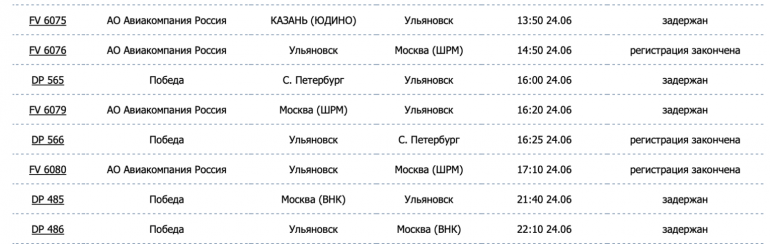 В частности, были задержаны рейсы из аэропорта Внуково и обратно, рейс из Шереметьево в Ульяновск, самолет «Победы» из Санкт-Петербурга, а также рейс из Казани в Ульяновск, который должен был доставить пассажиров столичного аэропорта Шереметьево.