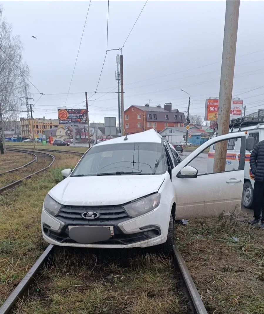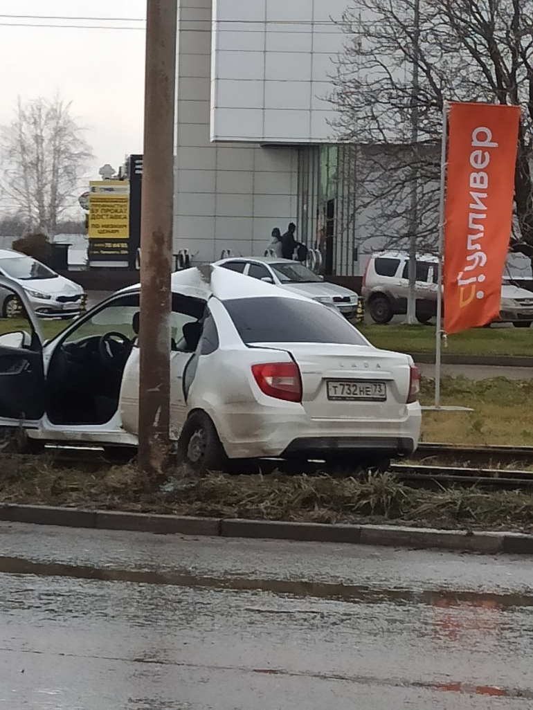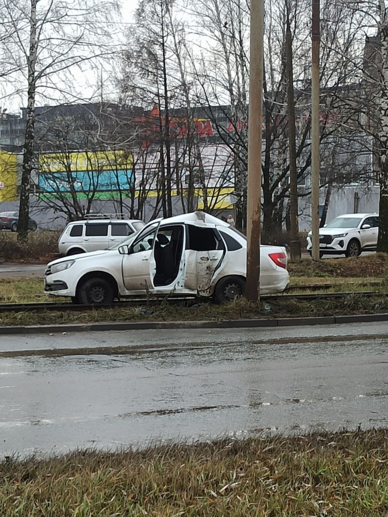 ВАЗ врезался в опору контактной сети и вылетел на рельсы. Он перекрыл движение трамваев в сторону конечной «Огни Севера».