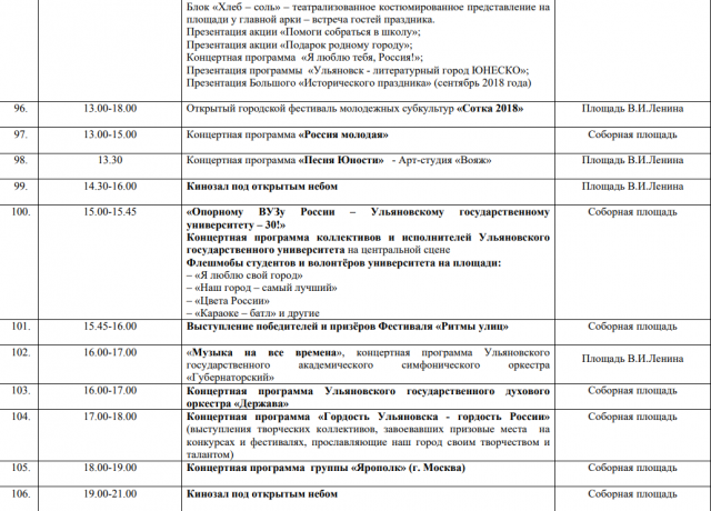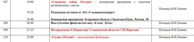 Также праздничные события пройдут в скверах и парках города. Всего около 360 мероприятий. С полной программой на 12 июня можно ознакомиться на сайте: www.ulmincult.ru/assets/files/FILES/2018/june/08.06.18/den-rus-18.pdf