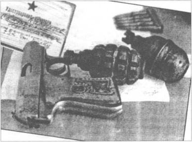 Радист показал на оборудованный под полом домика тайник, где были спрятаны пулемет Дегтярева, 2 винтовки с патронами, 10 гранат, 20 кг взрывчатки, 100 капсюлей-детонаторов, 120 м бикфордова шнура, аппарат для подслушивания, 60 тысяч советских денег, запасные батареи для радиостанции.