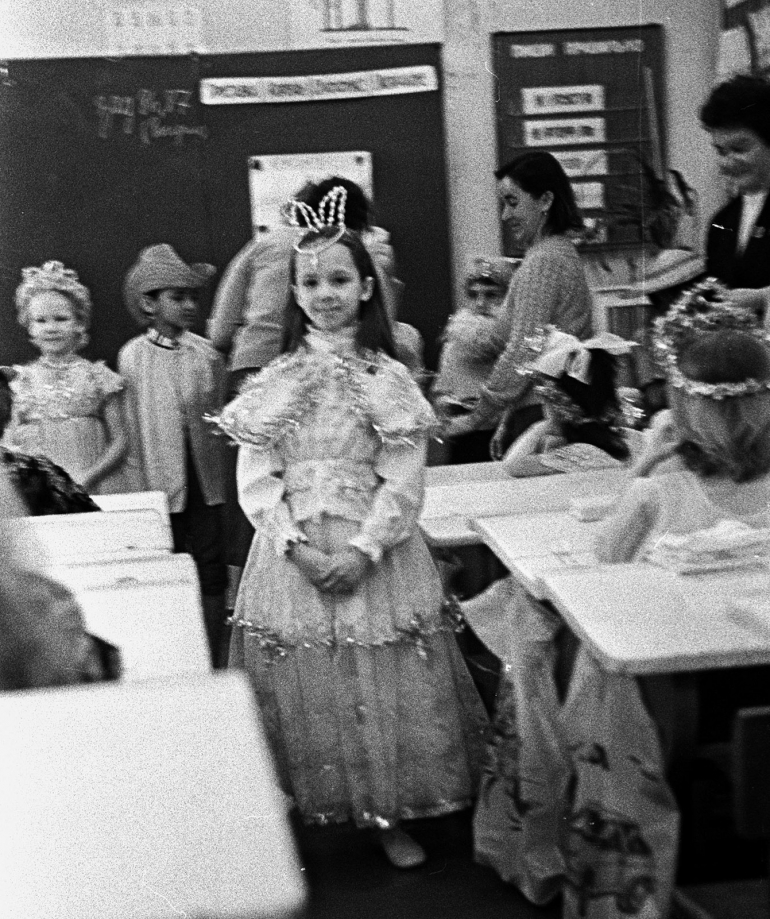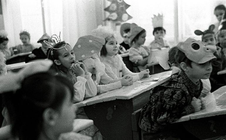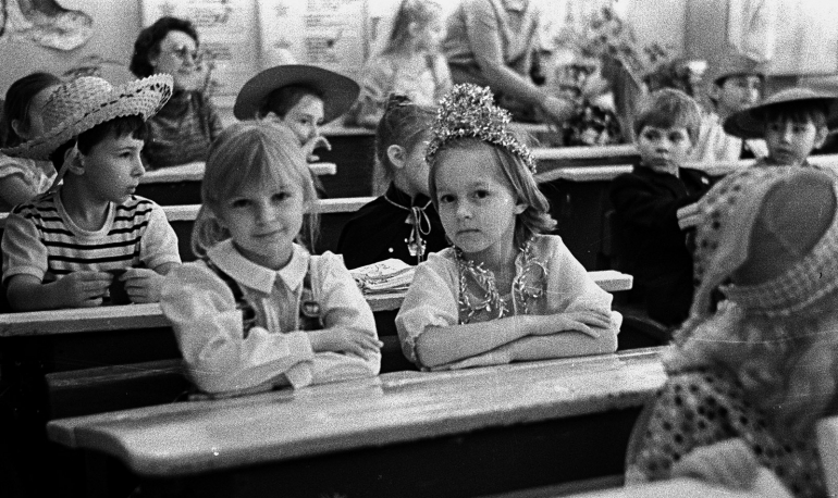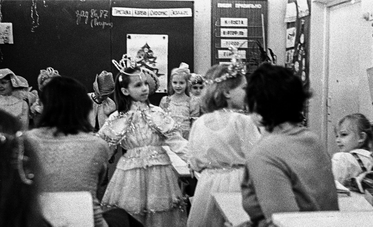 Новогодний декабрь 1988 года, утренник в ульяновской школе №2. Фотографировала Вика Ламзина. Девочки — сплошь принцессы и снежинки, мальчики — ковбои и пираты. Костюмы обычно были самодельными: на белое платье нашивали серебристую мишуру, из бусин делали короны.