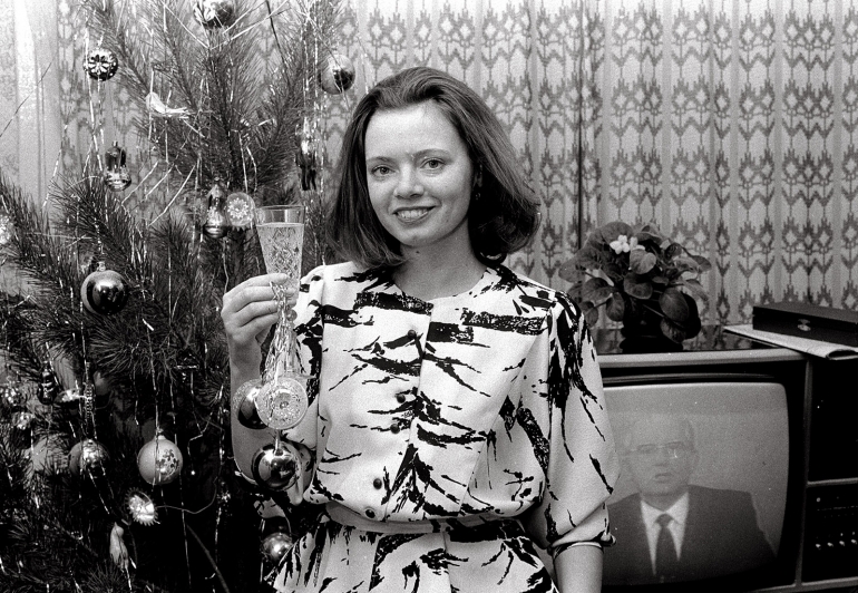 Встреча 1989 года. В телевизоре — поздравления Горбачева, в бокале — шампанское, которое покупали заранее, еще летом. В конце декабря достать бутылку игристого было очень трудно. На снимке Вера Ламзина.