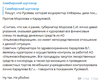 Телеграм-канал "Симбирский Шугожор" приводит следующие показания, якобы данные бывшим директором "Ульяновскфармации" Ольгой Русяевой: