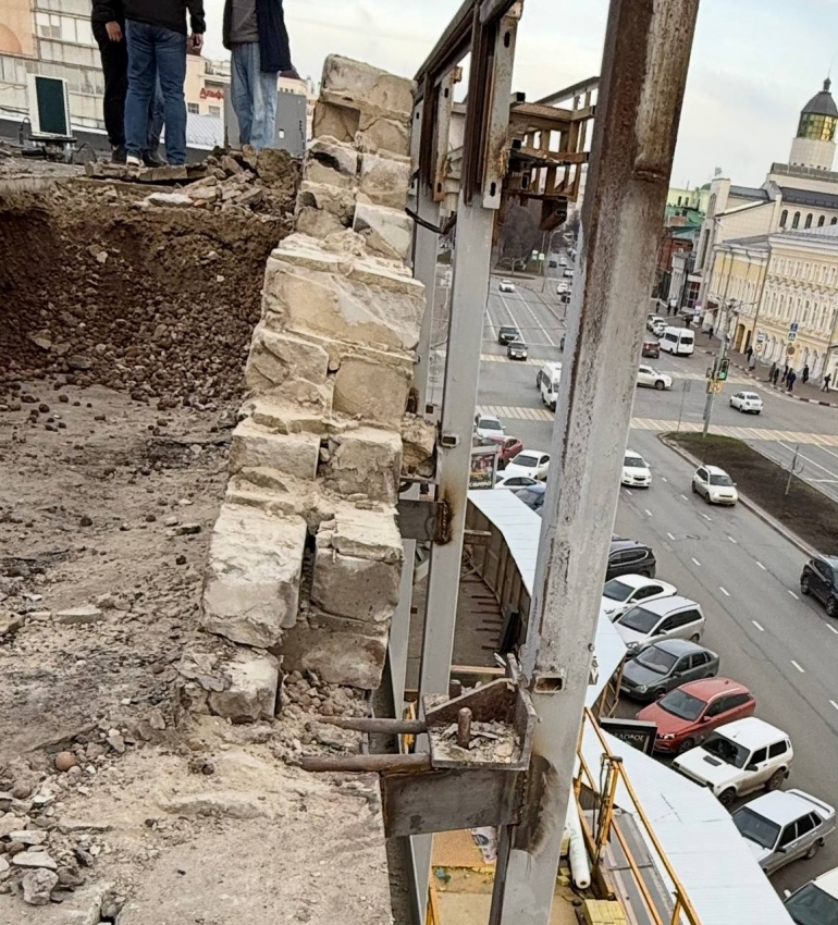 Начиная демонтаж аварийных элементов фасада, строители не предполагали, что вскроются новые проблемы. Так, после снятия рекламных конструкций, стало понятно и видно невооруженным взглядом, что парапет на крыше, выложенный кирпичной кладкой в момент строительства, находится в катастрофическом полуразрушенном состоянии и, самое страшное, имеет крен в сторону тротуара.