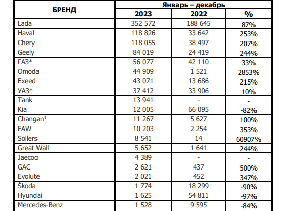 Наиболее популярным бредом у отечественных автолюбителей остается Lada с приростом продаж на 87% за год. Вторую строчку рейтинга занимает китайская марка Haval (+253%). Следом - ее «соотечественники» Chery (+207%) и Geely (+244%). Замыкает первую пятерку ГАЗ (+33%).