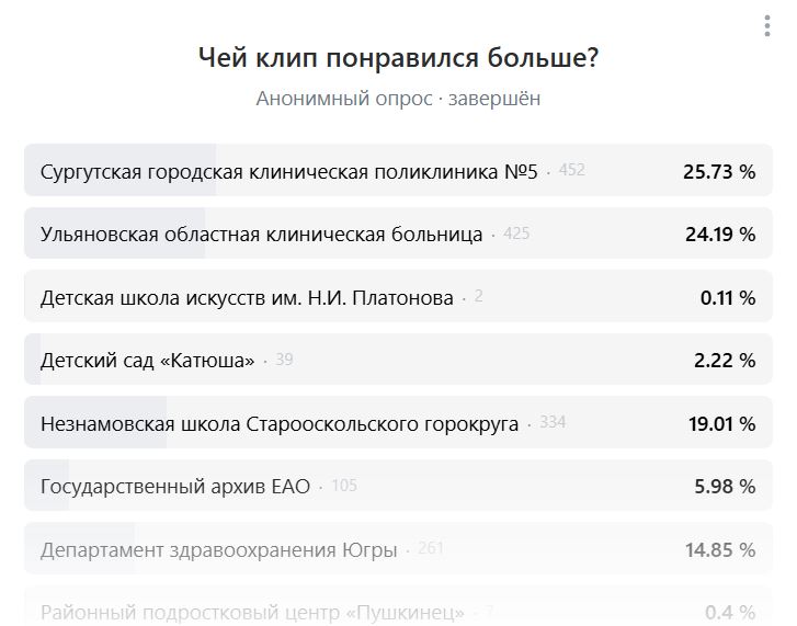 На первом этапе экспертная команда отобрала 10 роликов. Затем прошло открытое голосование в сети. По его результатам, видео ульяновской больницы получил 425 голосов и занял вторую строчку в голосовании.