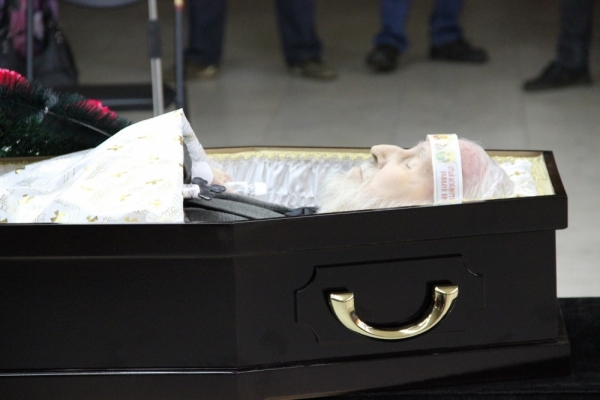 В начале церемонии прощания дочь музыканта Ксения дрожащими руками вытащила из коробки черную бабочку и надела отцу: