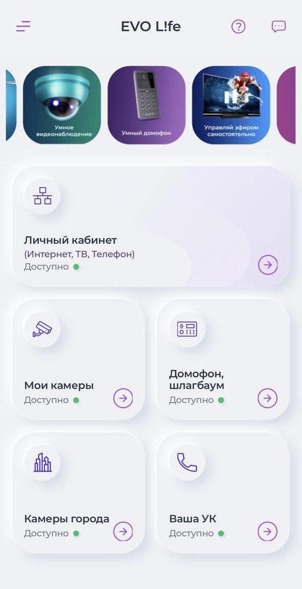 Продолжая тему видеокамер, которые также можно посмотреть через мобильное приложение EVO L!fe, то доступны следующие разделы: «Мои камеры» - здесь располагаются личные камеры клиента и раздел «Ваша УК» - камеры, установленные на многоквартирных жилых домах. Теперь, наличие такой услуги как «Видеонаблюдение» спасает от многих неприятных ситуаций. Например, грабитель, увидев камеру на доме, десять раз подумает, прежде чем отнять сумочку, а уличные хулиганы откажутся от мысли поцарапать авто. А если неприятное всё же произошло — можно получить записи, запросив доступ в архив у Управляющей компании.