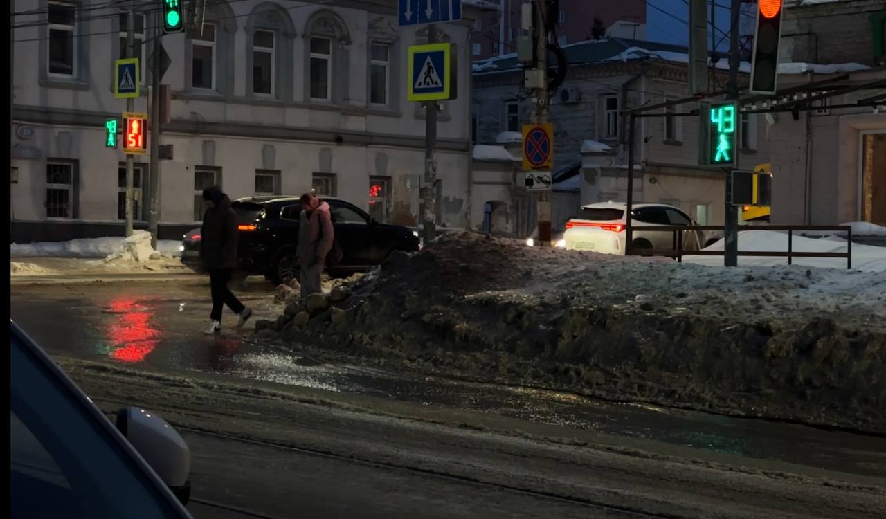 Холодная вода разливается по перекрестку улиц Марата и Карла Маркса.