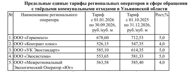 Тарифы на обращение с твердыми коммунальными отходами на 2026 год. Ульяновск и прилегающие районы обслуживает«Горкомхоз» и УК «Экостандарт».