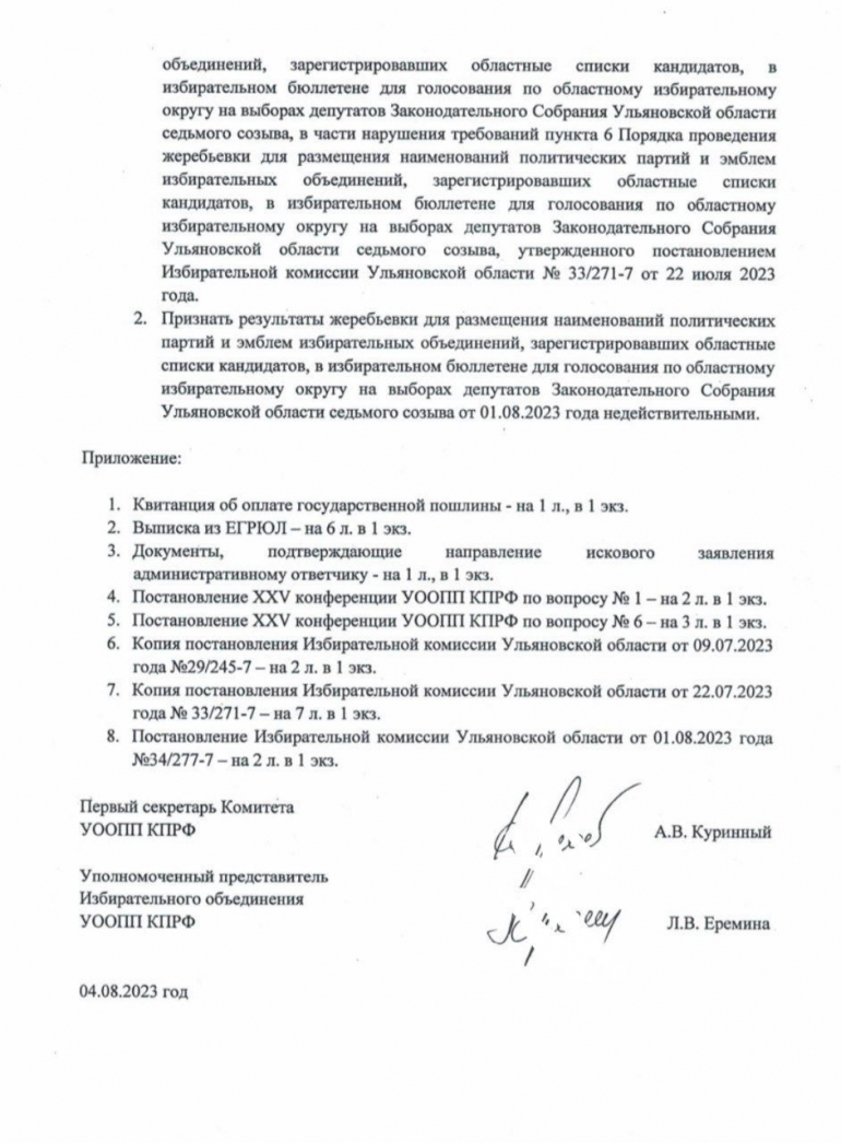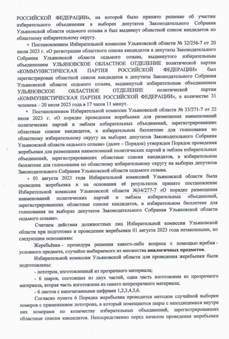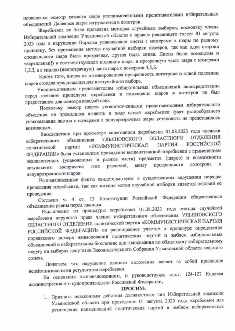 Вчера началось судебное заседание по иску ульяновского обкома КПРФ к областной избирательной комиссии. Коммунисты были недовольны итогами жеребьевки мест партий в избирательном бюллетене на выборы в Законодательное собрание области. Жеребьевка была проведена 1 августа, и КПРФ досталось 4-е место.