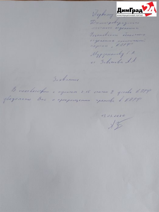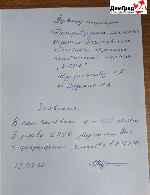 Пятеро димитровградских депутатов заявили о желании выйти из КПРФ. Не из фракции местного парламента, как это было раньше, а из партии вообще. Об этом сообщает портал dimgrad24.ru, публикуя заявления о прекращении членства в КПРФ.