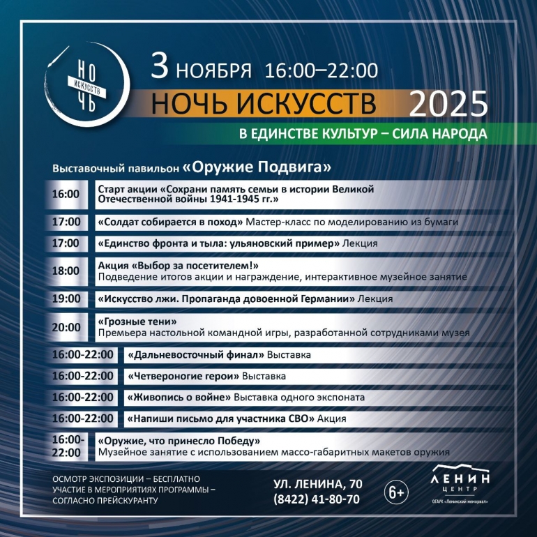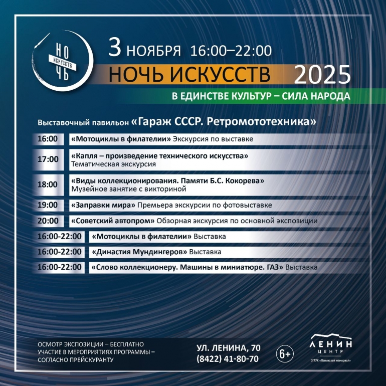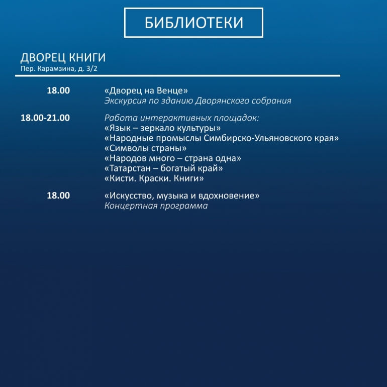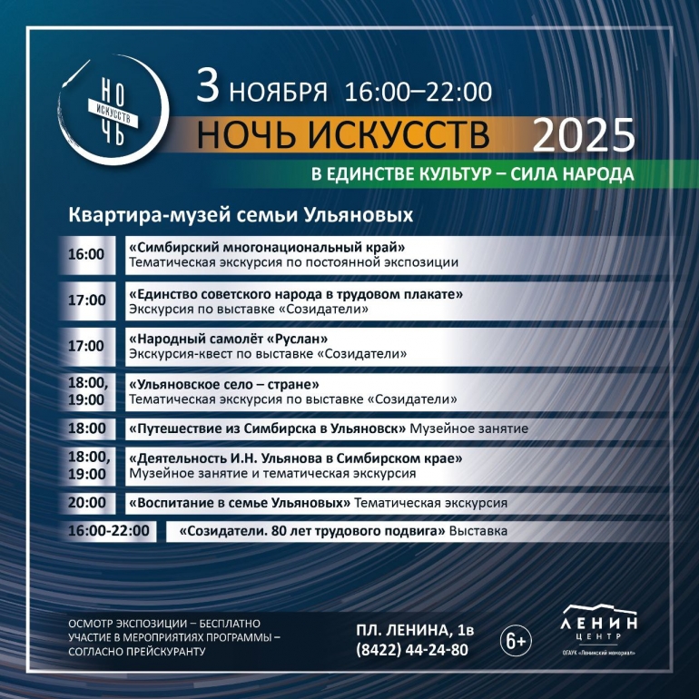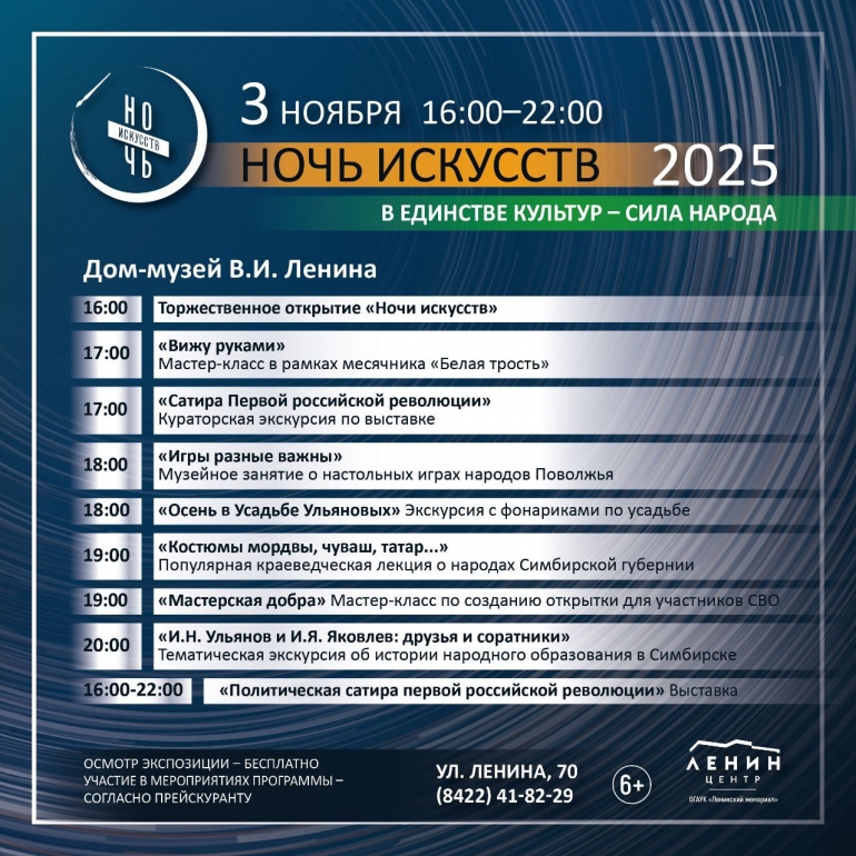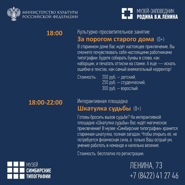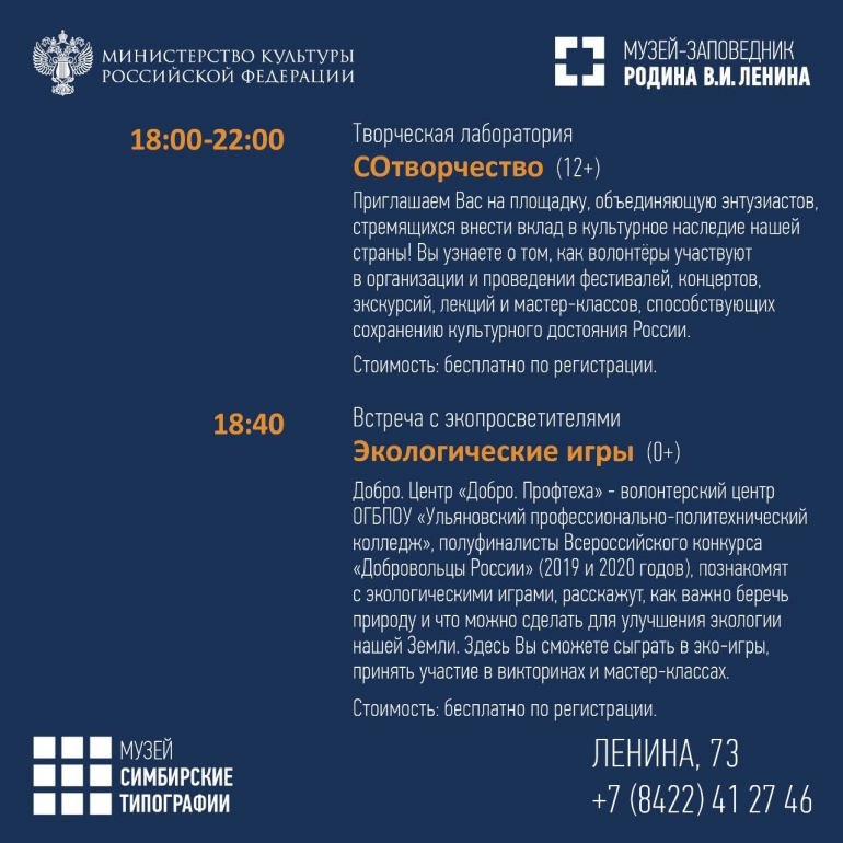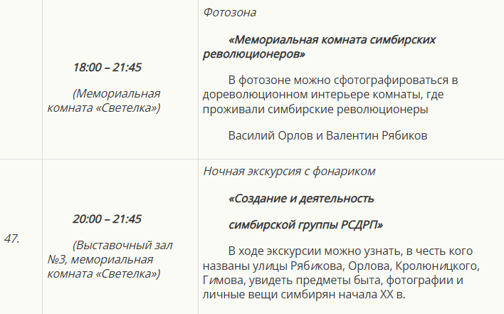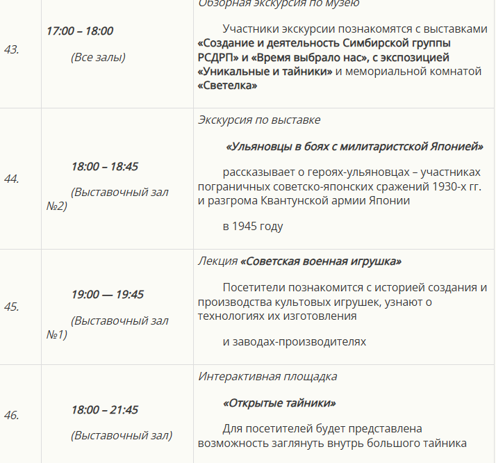 Посетить Дом-музей В. И. Ленина, Квартиру-музей семьи Ульяновых, выставочные павильоны «Гараж СССР. Ретромототехника» и «Оружие Подвига» можно будет в этот день с 16:00 до 22:00. Подготовлена обширная программа.