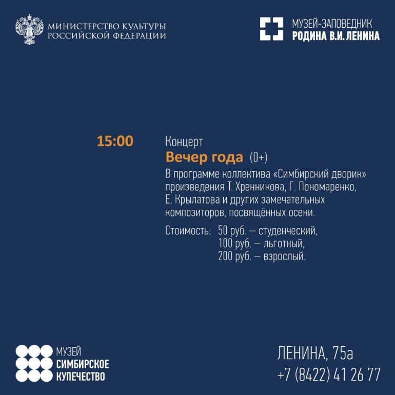 В 19:00 — авторская экскурсия «Симбирские собиратели искусства», посвященная 130-летию музея и уроженцам Симбирского края.