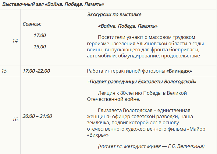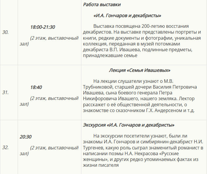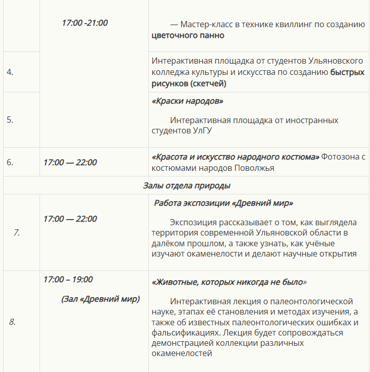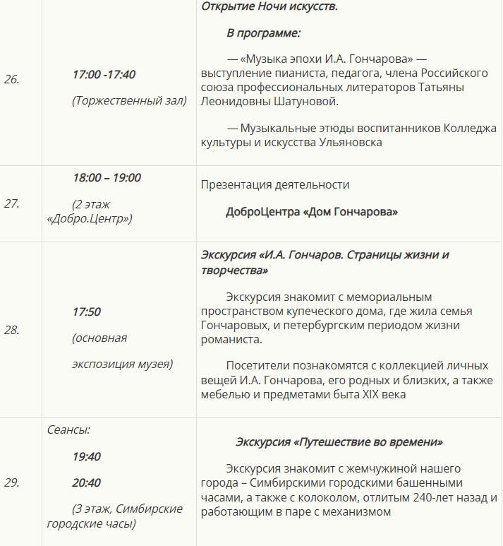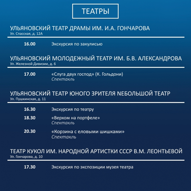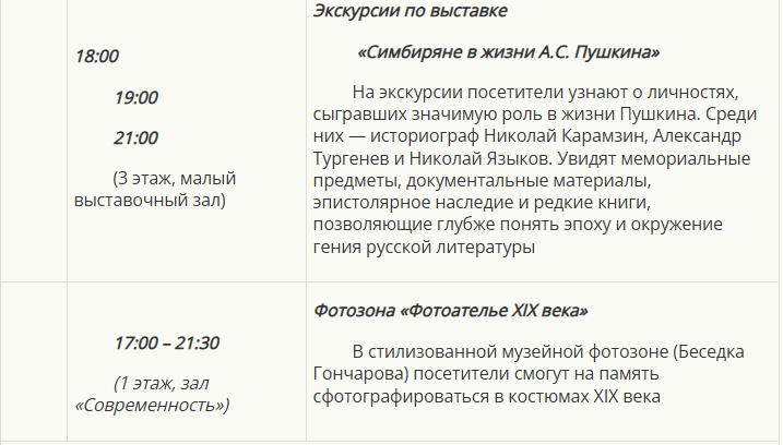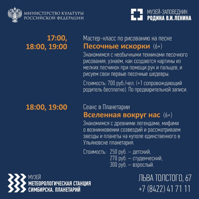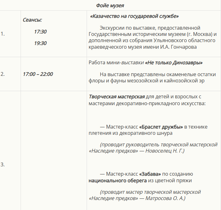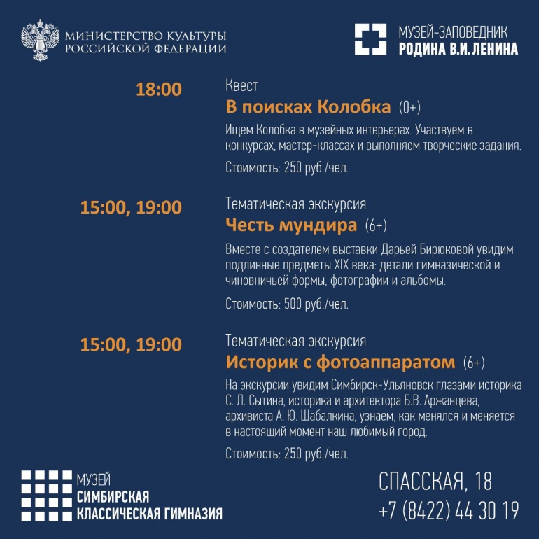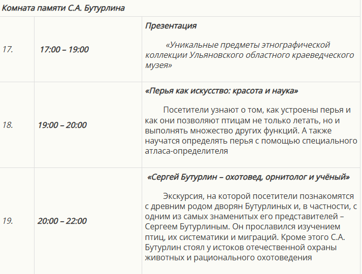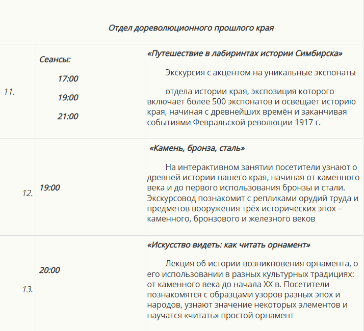 Музеи: «Симбирская классическая гимназия»; «Симбирское купечество»; «Пожарная охрана Симбирска-Ульяновска»; Музей-усадьба городского быта «Симбирск конца 19-начала 20 вв.»;«Мелочная лавка»; «Столярная мастерская»; «Симбирская чувашская школа. «Квартира И. Я. Яковлева»; «Метеорологическая станция Симбирска. Планетарий»; Выставочный зал «На Покровской» будут работать с 12:00 до 20:00.