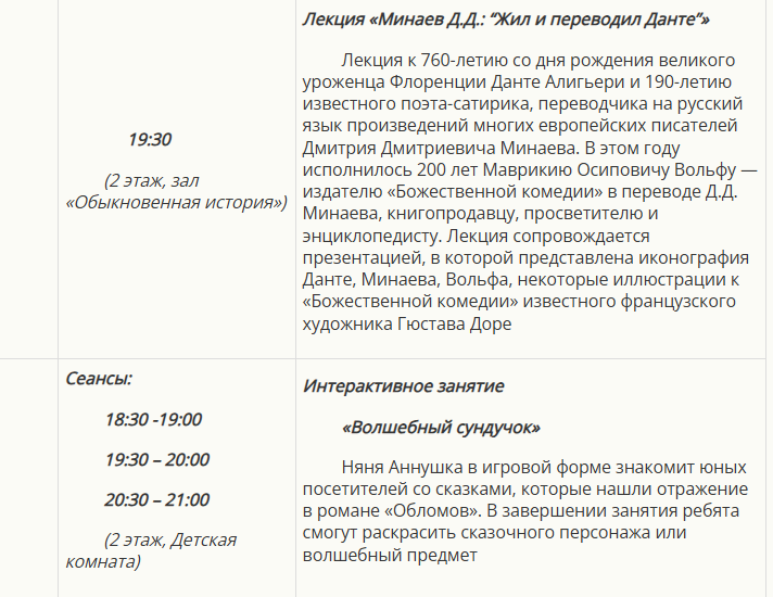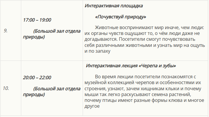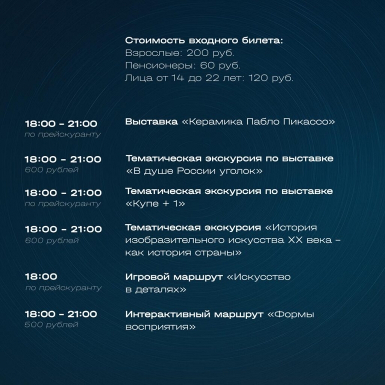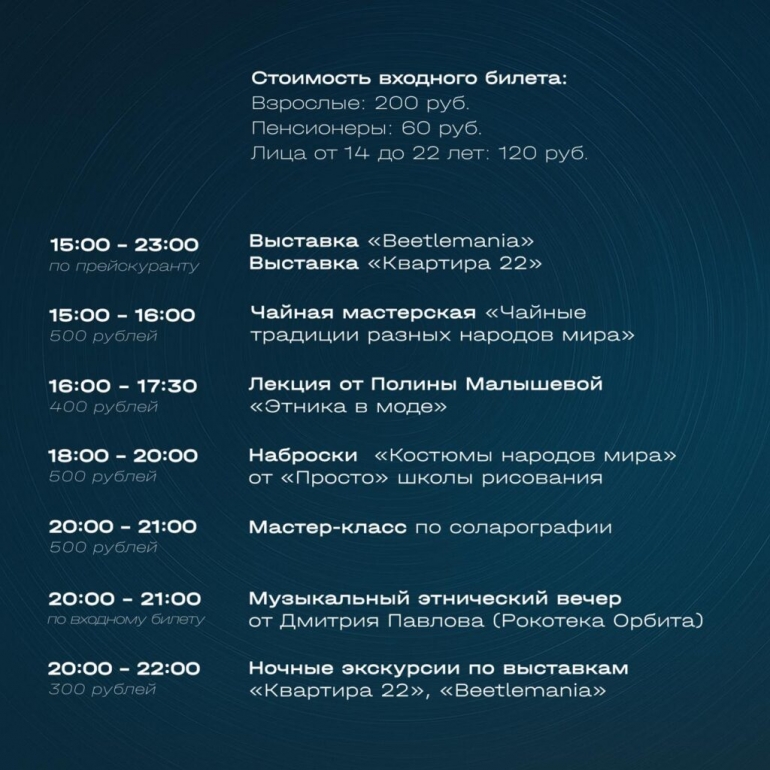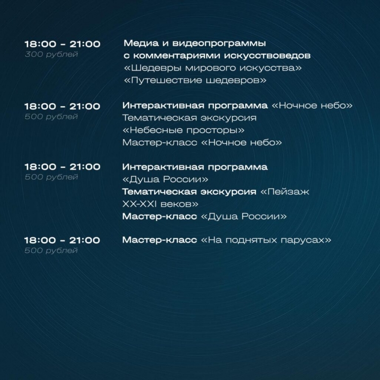 События Ночи с 18:00 до 22:00 (касса работает до 21:30).