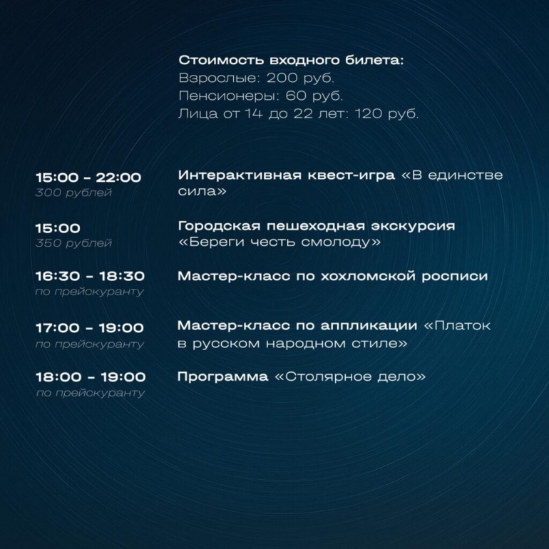 Вход на события ночи до 21:00 по прейскуранту (многодетные семьи, инвалиды, дети до 14 лет, участники СВО и члены их семей — бесплатно при предъявлении документа). Действует Пушкинская карта. С 21:00 до 22:00 вход бесплатный. Подробности тут.