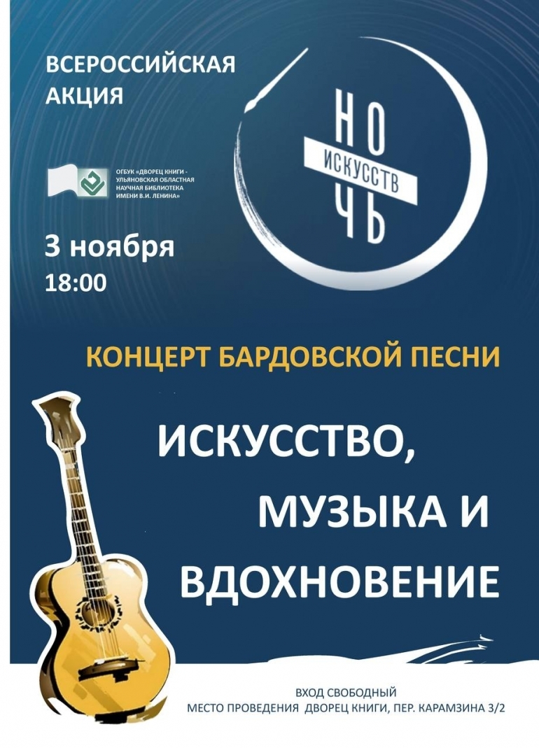 На первом этаже Нового здания пройдёт Центральное событие вечера — концерт бардовской песни. Также в программе мастер-классы, поэзия, экскурсия по зданию Дворянского собрания «Дворец на Венце».