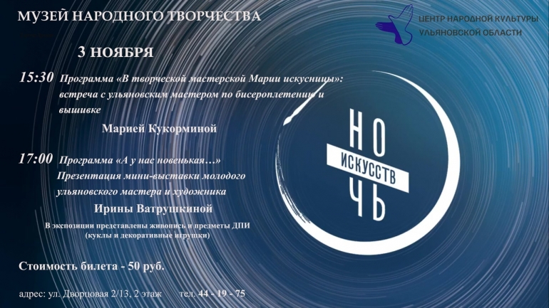 Ульяновские музеи третьего ноября ждут посетителей на Ночь искусств, которая пройдет под девизом «В единстве культур — сила народа». В программе: мастер-классы, экскурсии, лекции, игры, выставки — организаторы обещают, что интересно будет всем. 73online.ru публикует афишу.