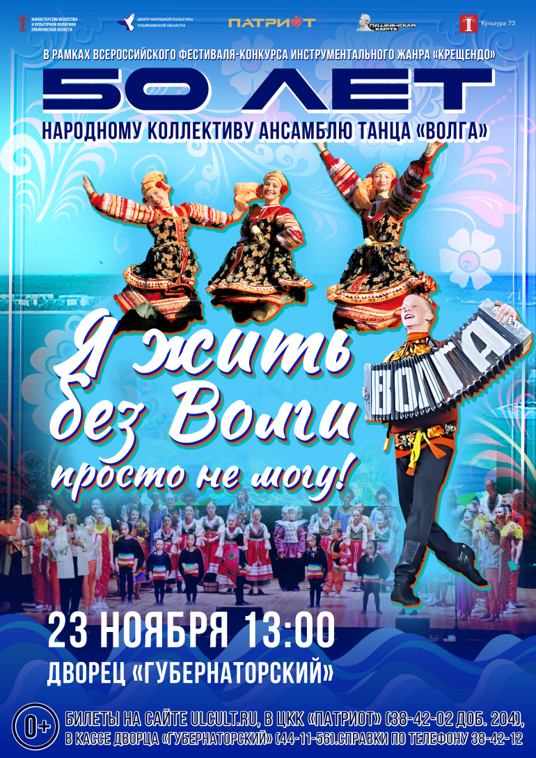23 ноября в 13:00 во Дворце дружбы народов «Губернаторский» (ул. Дворцовая 2/13) состоится юбилейный концерт, посвященный 50-летию народного коллектива ансамбля танца «Волга».