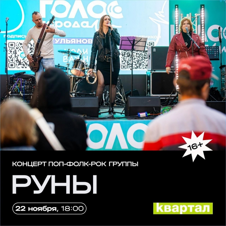 22 ноября в 18:00 в креативном пространстве «Квартал» (ул. Ленина, 78) прозвучит мощный коктейль из поп-рока, фолка и невероятной энергии от группа «Руны».