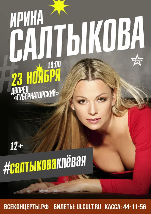 23 ноября в 19:00 во Дворце культуры «Губернаторский» (ул. Дворцовая 2/13) выступает легенда 90-х, главная блондинка российской поп-сцены Ирина Салтыкова. Она исполнит свои главные хиты:«Голубые глазки», «Серые глаза», «Будь со мной», «Розовый вечер» и другие треки, под которые невозможно устоять.