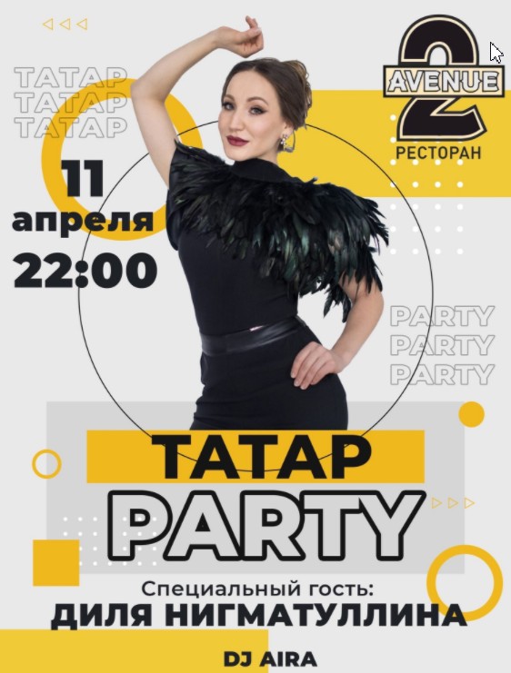 В воскресенье, 11 апреля, в 22.00 состоится вечеринка "ТАТАР PARTY". Место проведения: ресторан 2AVENUE, ул. Гончарова, д 30. Возрастное ограничение: 18+. Выступают: DJ AIRA, специальный гость — певица Диля Нигматуллина. Подробная информация тут.