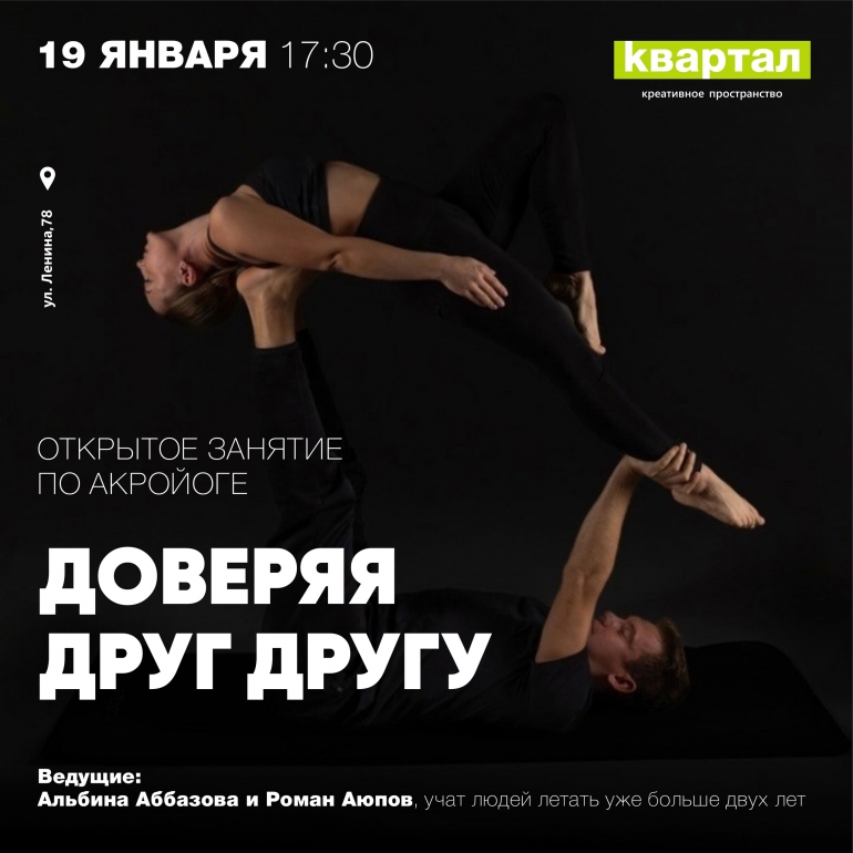 19 января в 17.30 в креативном пространстве «Квартал» (ул. Ленина, 78) состоится открытое занятие «Доверяя друг другу». Это возможность мягко и бережно познакомиться с акройогой, освоить парные балансы и базовые акробатические элементы. Занятие построено таким образом, чтобы каждый смог поймать ощущение полёта и удивиться возможностям своего тела. Приходите, даже если у вас нет спортивного прошлого, мостика и шпагата. Берите с собой коврик, воду, носочки, приходи в удобной одежде. Можно захватить друга/подругу/парня, а можно прийти одному. Подробнее здесь.
