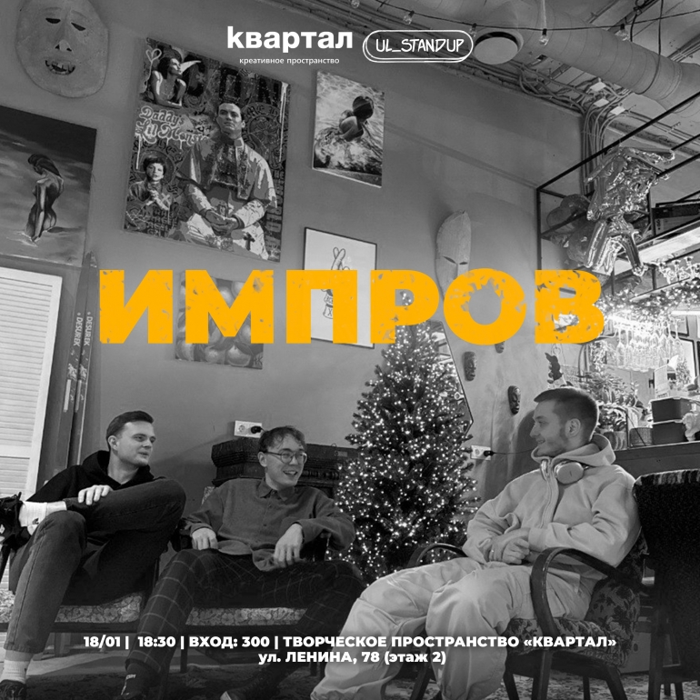 18 января в 18.30 в креативном пространстве Квартал (ул. Ленина, 78) состоится «Импровизация». Это шоу, где комики демонстрируют своё мастерство в импровизационной комедии. Высокий уровень творческой свободы в этом формате обеспечит уникальность и неповторимость каждого выступления. А еще всем тем, кто сильно любит импровизацию, организаторы предлагают примерить на себя роль актера-импровизатора прямо вместе с ними на сцене. Стоимость: 300 рублей.