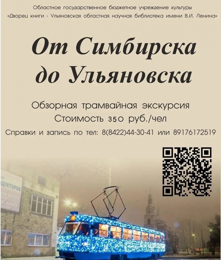 19 января в 11.00 в честь Дня образования Ульяновской области состоится трамвайная экскурсия, организованная специалистами Дворца книги. В ходе экскурсии вы познакомитесь с прошлым и настоящим нашего города! Вы услышите о старом Симбирске, об Ульяновске времён Великой Отечественной войны, а в панорамные окна трамвая увидите современный Ульяновск! Стоимость участия: 350 рублей с человека. Предварительная запись обязательна. Экскурсия состоится при наборе группы не менее 20 человек. Запись и справки по тел: (8422) 44-30-41 или 89176172519 — Наталья. Место встречи: на кольце Северного трамвайного депо, ул. Радищева, д. 144а.
