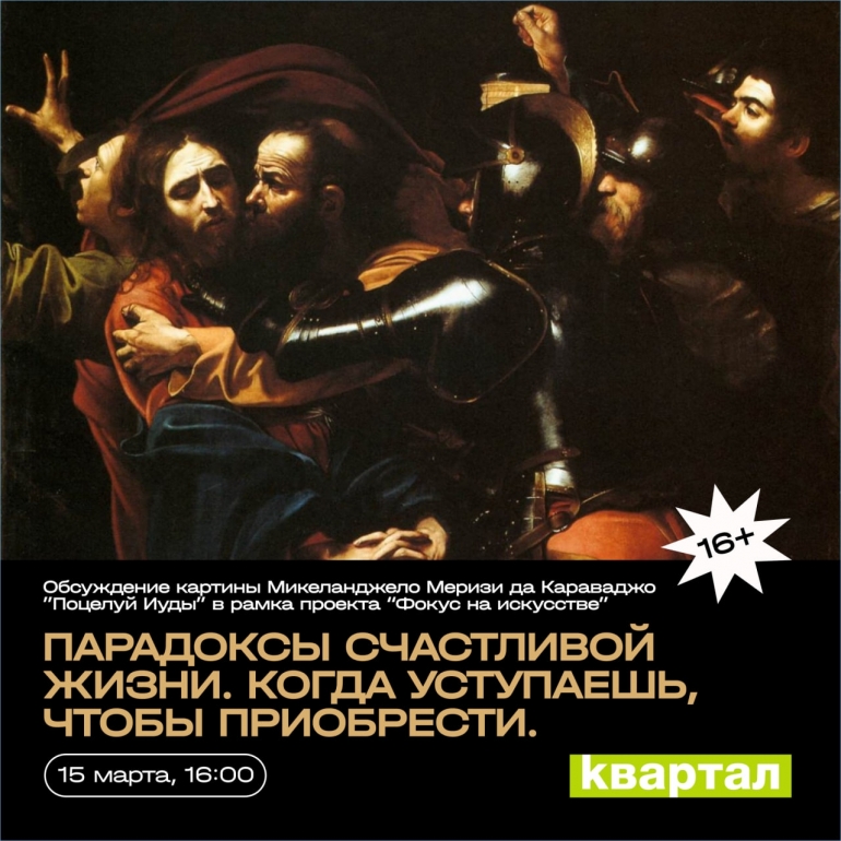 В креативном пространстве состоится обсуждение картины Караваджо «Поцелуй Иуды» в рамках проекта «Фокус на искусстве». Караваджо (1571-1610) — итальянский художник, реформатор живописи XVII века, яркий представитель барокко. Он первым применил «кьяроскуро» и «тенебризмо», работая с живых моделей без эскизов.