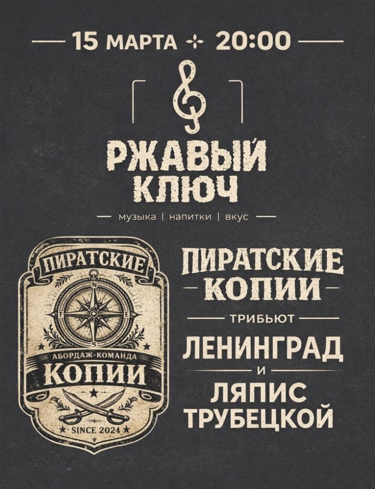 Трибьют-группа «Пиратские Копии» представит программу с лучшими хитами культовых коллективов «Ленинград» и «Ляпис Трубецкой». Концерт наполнен драйвом и настоящим роком, который не оставит равнодушными любителей живой музыки и энергичных выступлений.