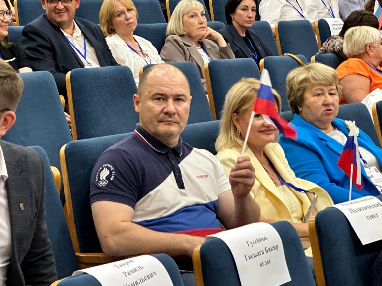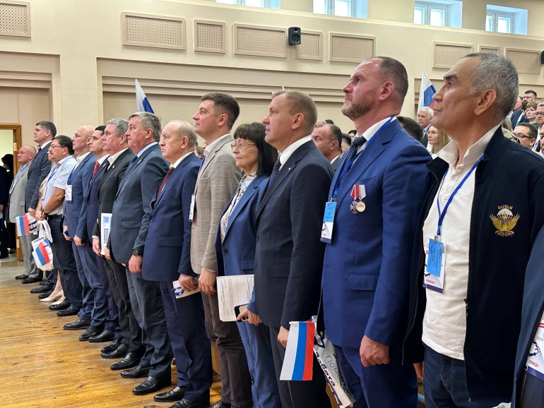 143 делегата начали занимать места. Депутат Гордумы Дмитрий Кочкарев в цветах флага России, депутаты ЗСО Сергей Шерстнев, Вячеслав Ковель, Денис Седов и Мария Шпак, ректор УлГПУ Игорь Петрищев (между ними на фото 4).