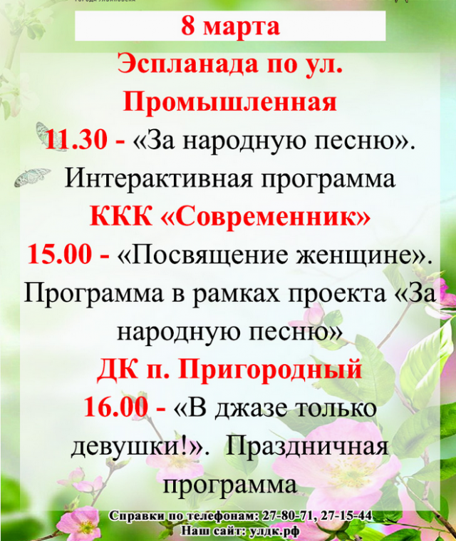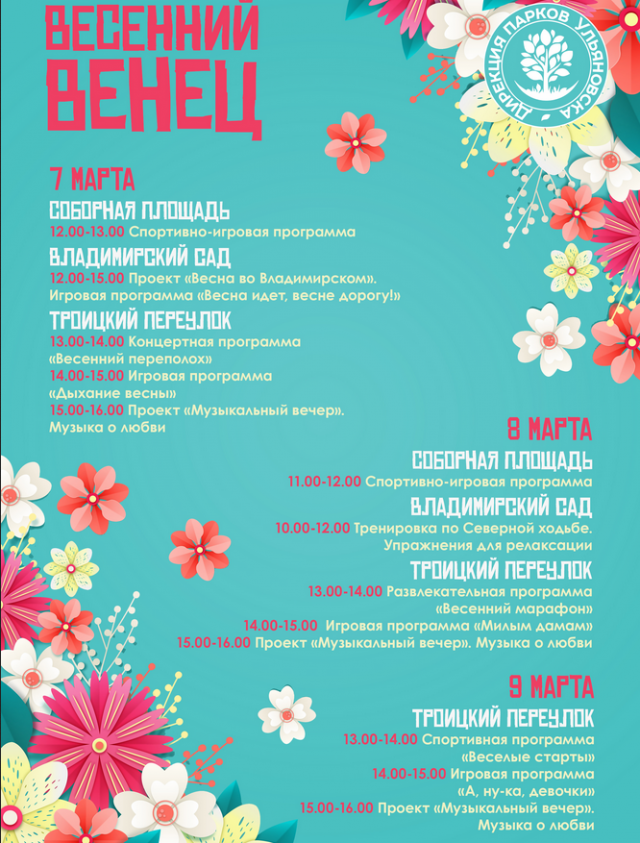 Ульяновцев приглашают на праздничные мероприятия, посвящённые Международному женскому дню. Они пройдут в парках, на открытых городских площадках и городских домах культуры.
