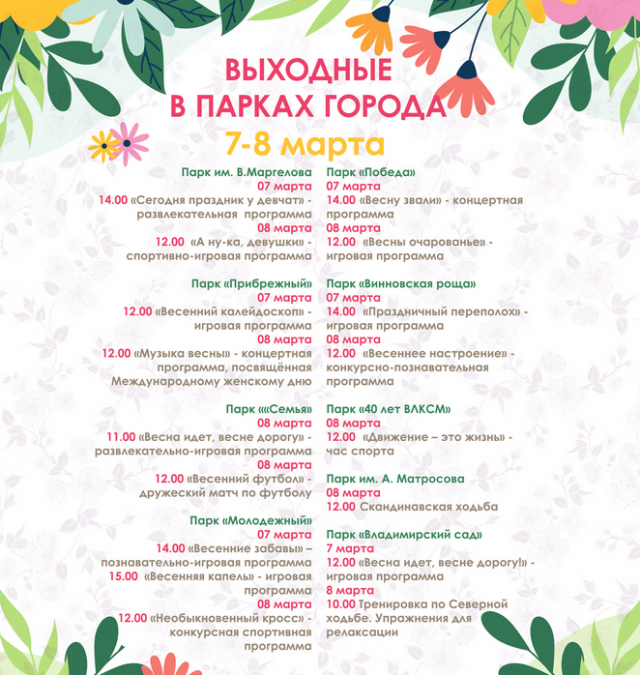 Также 8 марта в парках «Победа», «Прибрежный», «Винновская роща» и «Молодежный» пройдут концерты, конкурсы и спортивные состязания.