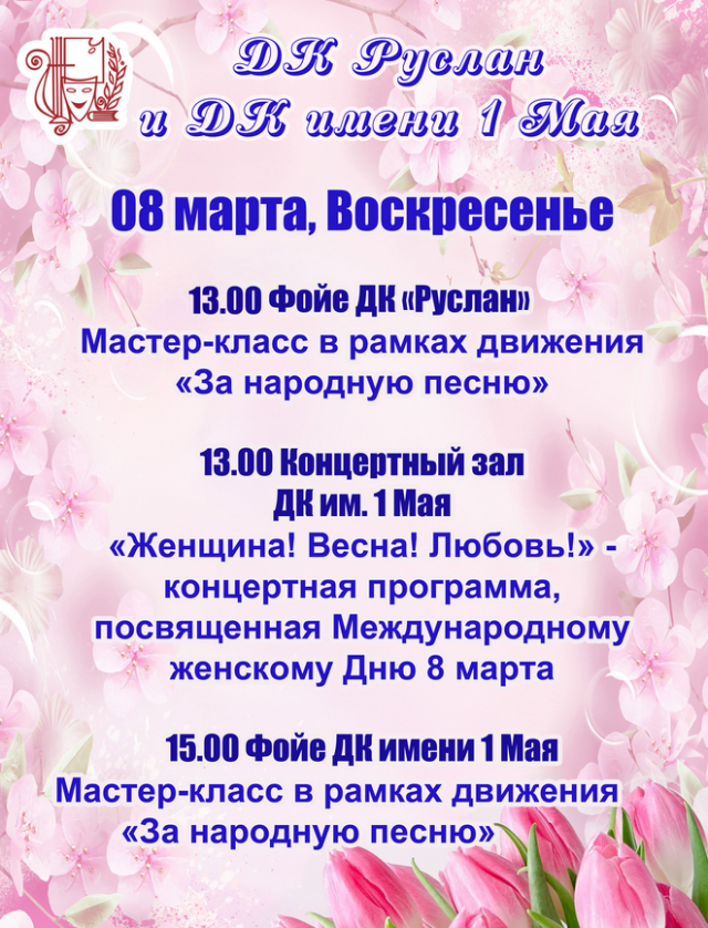 8 марта в Троицком переулке в 13:00 жителей ждет развлекательная программа «Весенний марафон», а в 14:00 – игровая программа «Милым дамам».