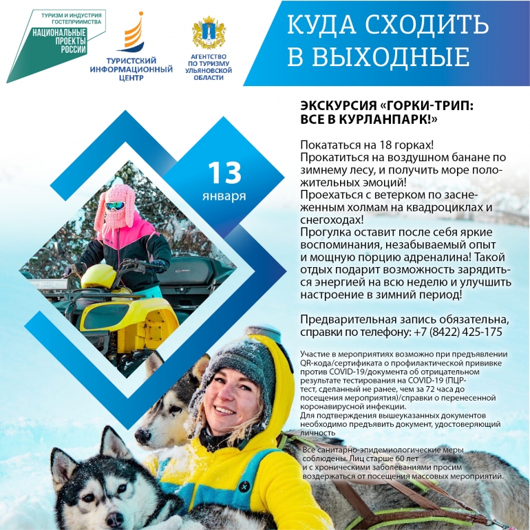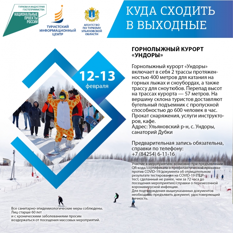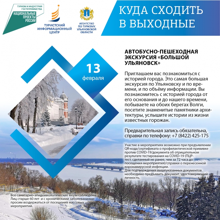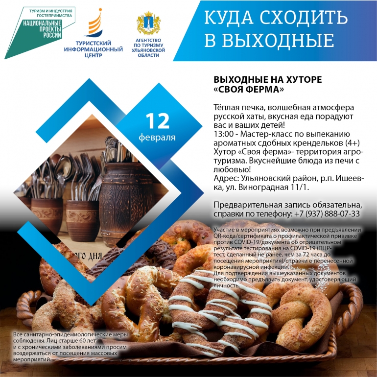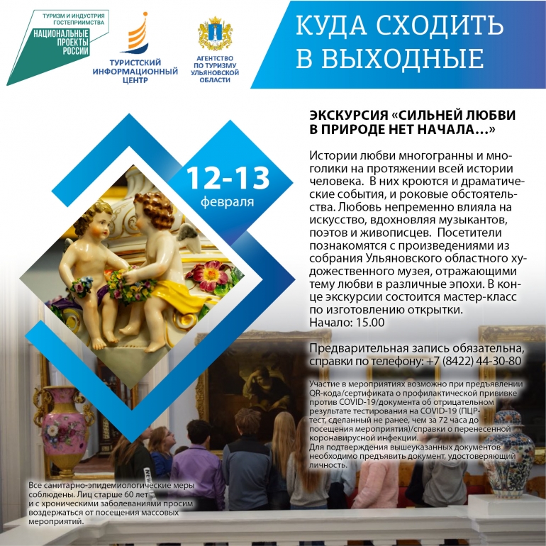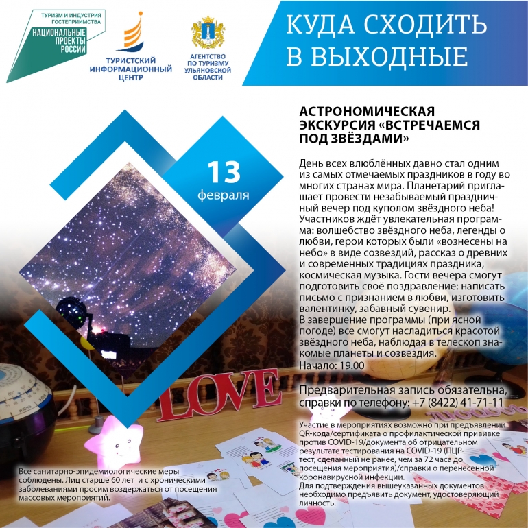 Вы уже готовы с головой окунуться в атмосферу зимних забав и романтику наступающего Дня влюблённых? Агентство по туризму Ульяновской области подготовило подборку мероприятий для активного отдыха в выходные. Прокатитесь верхом на лошади, посетите мастер-класс по выпечке сдобных кренделей, полюбуйтесь красотами звёздного неба в планетарии или прогуляйтесь по улицам города. Напоминаем, что участие в экскурсиях и вход в музеи возможны при предъявлении QR-кода, отрицательного ПЦР-теста или справки о перенесенной коронавирусной инфекции.