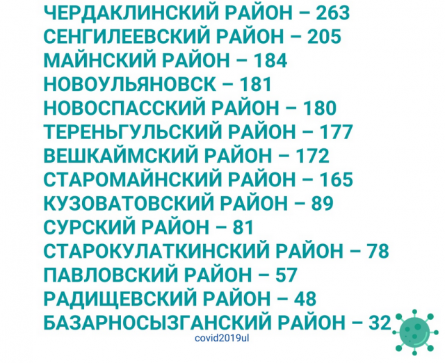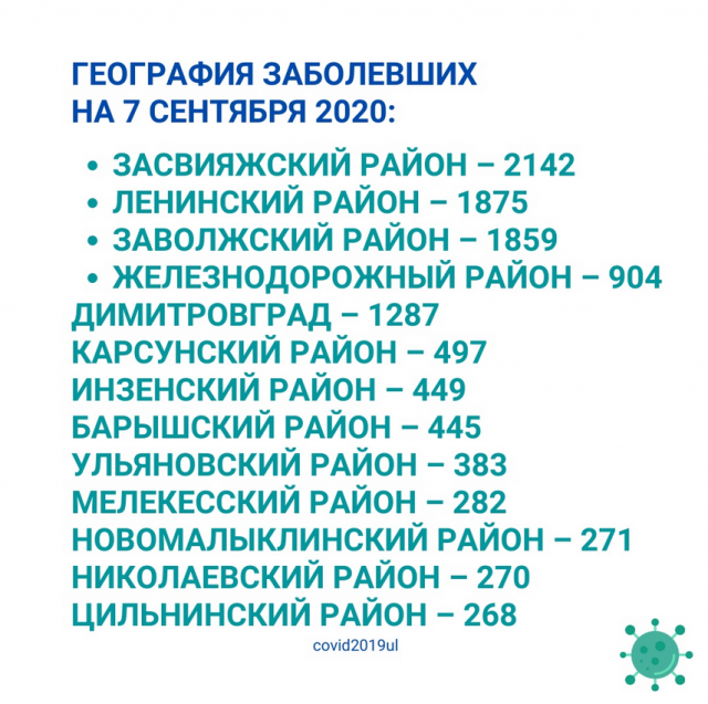 Самое большое число заболевших отмечается в Засвияжском райне Ульяновска – 2142. Меньше всего – в Базарносызганском районе. Там коронавирус выявлен у 32 человек.