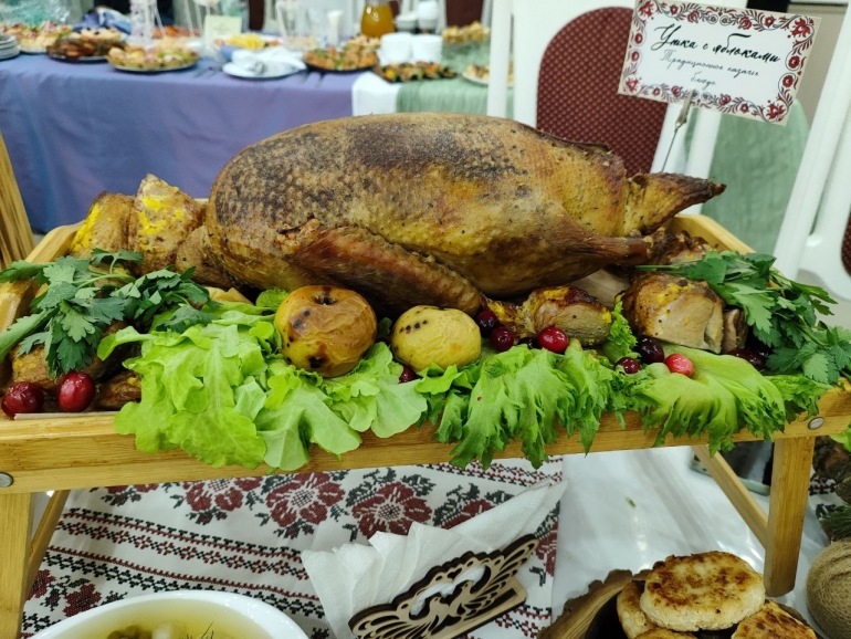 Казачка Анастасия Матвеева из Новоспасского района угощала уткой, начиненной яблоками, сырами собственного приготовления, ковбыком (фаршированный свиной желудок), раками, щучьими котлетами, свиными ребрами, тыквенными цукатами, облепиховым вареньем, домашним вином. Без помощи спонсоров района не обошлось, конкретную сумму участница не назвала: дорого-о-о!
