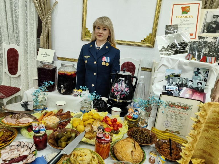 Сотрудница ИК-9 Анна Васильева выступала в парадной форме. Наготовила блюда стран, где служили мужчины семьи либо родился кто-то из родственников: литовский торт шакотис, немецкие колбаски, украинские, чувашские, русские угощения.