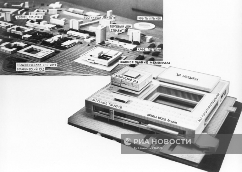 Макет Ленинской мемориальной зоны и Ленинского Мемориала по проекту А. И. Бросмана. В центре Ульяновска могли построить торговый дом «Столбы» и крытый рынок на месте «ямы», где останавливались автобусы.