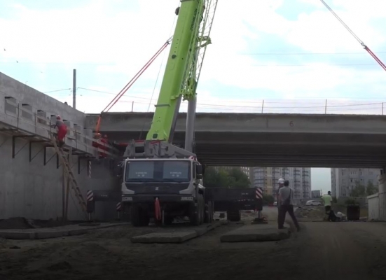 - На стройплощадке задействована тяжёлая техника, крановщики работают с ювелирной точностью. Всего в проектное положение смонтируют девять железобетонных конструкций, длина каждой из них 24 метра. Эти работы строители планируют завершить в течение двух дней. После установки балок путепровод примет законченный вид, - рассказал мэр.