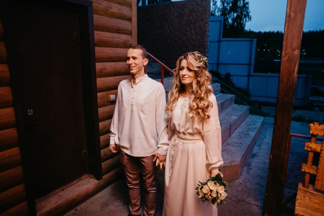 - Я хотела свадьбу в русском стиле, но в то же время мне хотелось, чтобы у меня было нежное красивое платье. Поэтому мы решили делать два образа: один на росписи, а второй на встрече родителей жениха с караваем. Первое платье я полностью придумала сама. У него была атласная юбка и пояс расшитый бисером. Супругу выбрала костюм в шоколадном оттенке. Второй образ был в русском стиле. Мне хотелось, чтобы на моем платье была вышивка. Я составила рисунок из языческих символов. И его вышили на рукавах платья и на рубахе Кирилла.